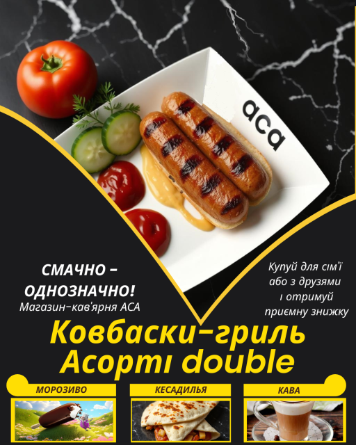 Дві соковиті ковбаски з м'ясного фаршу Асорті і спецій, засмажені на грилі, у поєднанні з свіжими овочами - ситно, поживно та смачно. Смакуймо з нами