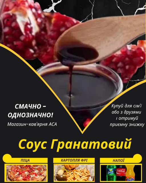 Ніжний ароматний Гранатовий соус доповнить ваш вибір із переліку продукції стрітфуду нашого магазину-кав'ярні і принесе вам неабияке задоволення від його споживання.